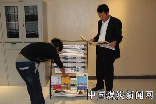 9月10日上午,陕北矿业涌鑫公司工会主席陈忠亮将书报架亲自送到区队,区队职工高兴之余立即把书报架组装好,放上该公司发的报纸、杂志、书籍,图是该公司区队职工组装书报架、看报纸的情景。