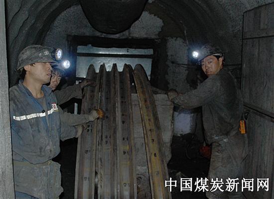 为了加快掘进速度,工区采取了一系列的鼓励措施:只要1025风巷每个小班进尺在5棚以上(包括5棚),工区对当班班组每棚嘉奖100元,而且在光荣榜上进行表扬。于是每个小班你追我赶,接班班组进班后,催促交班班组尽快离开,以免影响自己班组的工作时间。于9月8日零点班打创了1025风巷进入机掘以来的最高纪录,即1025风巷首次进尺6棚即4.8米。图为工人们往施工地点运送u型棚梁。(刘江平 文 高毕勇 摄)