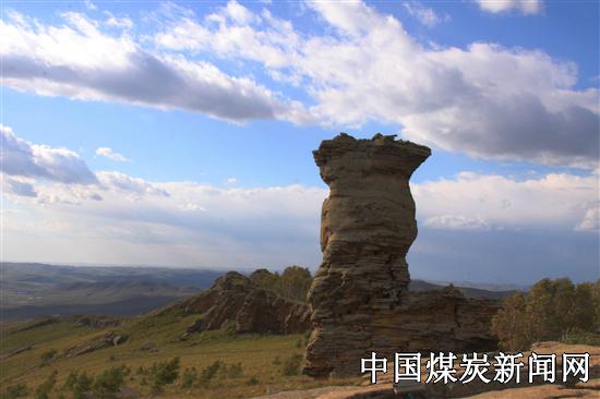 注:克什克腾世界地质公园地处大兴安岭山脉、燕山山脉、浑善达克沙地三大地貌的结合部,地质遗迹丰富多样,风光旖旎,山异、石奇、水美、林丰,自然景观与人文景观交相辉映。传说当前成吉思汗举兵南下,战马曾拴在这个10多米高的石柱上。