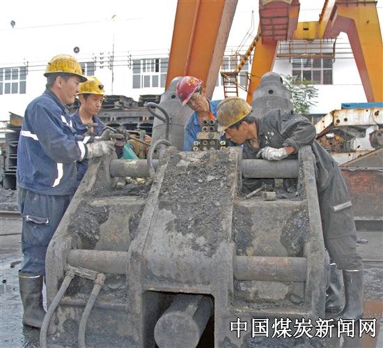 近日,平煤股份十三矿己15、17——12020采面的安装需要109架ZY6400——20/40液压支架,所安装的支架是从己15、17——13021采面回收到该厂的废旧支架。为确保新采面安装,该厂倒排工期,制定奖罚制度和检修标准,分八点、四点、零点三班进行检修支架,每班检修2架为基本任务。图为9月25日4点班职工正在检修支架。