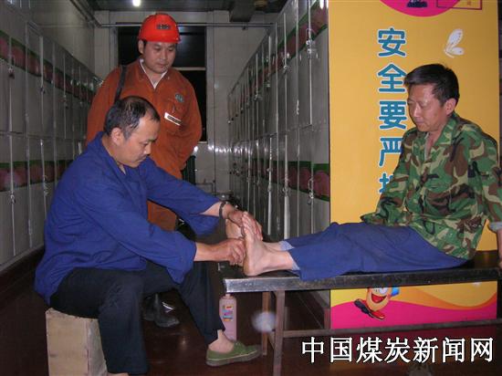 曹富贵今年44岁,在井下干了20多年机电工,后来调到洗浴中心工作。他说:“他原来也得过肩周炎,每逢阴天下雨,疼得睡不着觉,听说按摩能治疗肩周炎,于是就买了按摩书籍,照着书上说的按摩,也去请教过专业按摩师,慢慢学会了一套人体按摩技术。曹富贵知道下井职工易患关节炎、肩周炎等病症,于是萌发了免费为职工按摩的想法。为了让职工相信自己的按摩技术,他先为洗浴中心同班的工友按摩,被按摩的工友都说按摩后,身体特别舒服,明显有劲有精神。为了让下井的职工都知道他免费为大家服务,他在洗浴中心和整容镜一侧,张贴了几张免费按摩“小广告”,并写上了自己的手机号码,以方便职工随时找他按摩。和他一起工作的老工人马金华师傅说:“他患有糖尿病,没事的时候,曹富贵就给他按摩脚部穴道,按摩了四五次次,没吃药没打针,血糖竟下降了3个点,身体也感觉比以前有劲了,曹富贵真是个好人。” 曹富贵在班上时,如发现上井洗浴职工身上,有贴膏药或拔罐印痕的,就主动上前询问病情,告诉他自己会按摩,如需要服务,洗浴完后可以找他免费按摩。有的职工开始不相信,说哪有那样的好事。时间久了,大家才知道,洗浴中心的确有个热心助人,免费按摩师曹富贵。有的来按摩的职工脚部患有脚气,曹富贵也不嫌弃。他说:“脚部是人体的第二心脏,是人体健康的阴晴表”。有的职工被他按摩二三次,肩疼、颈椎疼症状就明显减轻。有的职工看到曹富贵为自己按摩累的满头大汗,心里过意不去,想请他去饭店吃顿饭,都被他婉言谢绝。他说:“你们要是请我吃饭,那能叫免费吗,我学了这点按摩技术,尽我的微薄之力为你们按摩,让你们身体壮壮的,好好上班,多出煤、多进尺,效益好了大家都跟着好”。 诚实朴素的话语透出曹富贵热爱矿山,关心工友,乐于助人的良善之心。 图为:曹富贵在为职工按摩。