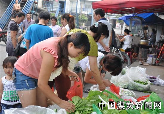 本网讯为了方便职工的家庭生活,满足职工的生活需求,翠屏山煤矿把老营部活动板房的空闲地带划出一块作为小市场给职工摆摊设点,买卖鸡、鸭、鱼、肉、瓜果、蔬菜,丰富了职工的物质生活。图为该矿老营部职工家属在挑选新鲜蔬菜的现场。