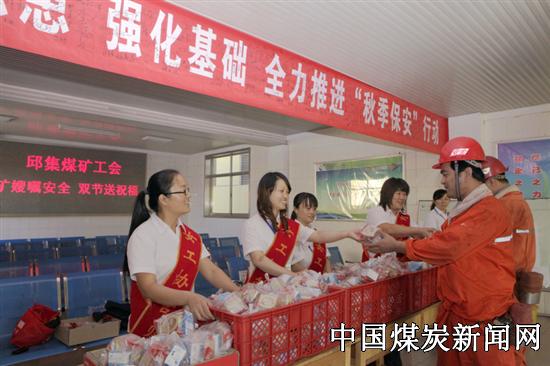 【本网讯】“双节”到来,山东能源临矿集团邱集煤矿工会女工协管会紧紧围绕矿井安全生产中心,针对节日特点,突出自身优势,在副井侯罐大厅开展了“矿嫂嘱安全、双节送祝福”服务活动,用亲情营造出保节日安全生产的浓厚氛围。 该矿工会女工协管会常年把副井作为服务煤矿安全工作的“前沿阵地”,及时宣传上级安全指示精神,并在每年安全月、传统节日、安全工作薄弱阶段,组织女工家属开展“亲情嘱安全”活动,将“安全生产大于天、安全生产重于山”的意识传递到每个下井作业的矿工。她们在自身长期开展的“天天嘱安全、月月筑防线、季季促平安”活动基础上,为助推矿深入开展以“查治隐患、打非治违、强化基础、预防事故”为主题的“秋季保安”行动上,又精心策划组织了此次节日期间的“矿嫂嘱安全、双节送祝福”服务活动,安全协管矿嫂们分三班在副井候罐厅带着节日祝福把一块块儿象征团圆、平安、吉祥的月饼和一盒盒牛奶送到了矿工师傅们手中,同时叮嘱矿工兄弟下井注意安全。 据统计,在此次“矿嫂嘱安全、双节送祝福”服务活动中,该矿为一线职工送月饼400余斤,牛奶千余盒,实实在在营造出节日保安全的浓厚氛围。