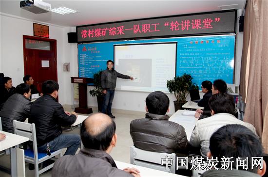 山西潞安集团常村煤矿综采一队为提高职工素质与技能,建立了“轮讲课堂”,要求每名职工从设备的原理、操作、故障、处理等内容进行备课、授课、听课、评课,做到精益求精。自2012年5月份试运行以来,截至目前,已组织25期,全队295余人,有80%职工参与了此次活动。事故率与去年同期相比下降了20%,其中第四季度实现安全零事故,为历年最好。图为常村煤矿综采一队职工正在讲课。