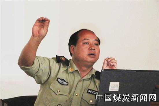 战训科工程师 科长林伟在小队长课堂上讲解矿井通风技术数据“5”个点的表达姿态