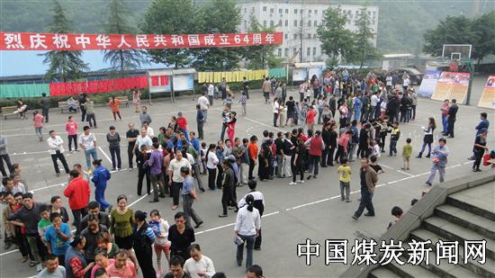 【本网讯】 为庆祝中华人民共和国成立64周年,10月1日,川南煤业公司鲁班山北矿工会、团委、女工家委在职工食堂广场开展庆国庆趣味活动。全矿不当班的1000余名职工参加了活动,感受节日的喜庆。