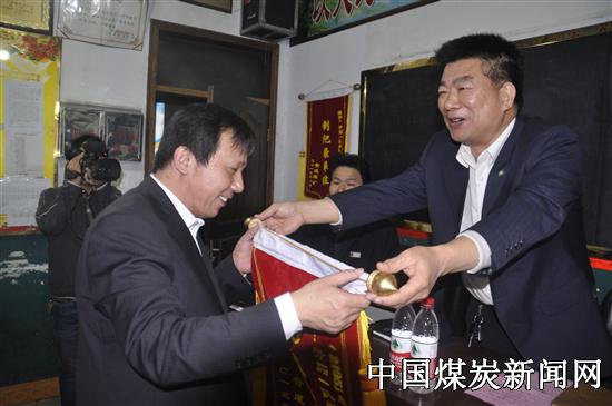 赵主席代表矿党政工向该队辛勤工作的全体职工致以亲切的慰问,并发表了热情洋溢的讲话,他说:“取得这样的成绩,不仅为矿上赢得了荣誉,还为矿井生产提供了保障,这是全队干部职工辛勤工作、顽强拼搏的结果,这样的成绩来之不易,令人鼓舞,同时,也希望全体干部职工再接再厉,再谱新篇,为告成矿的跨越发展做出新的贡献。” 图为该矿领导为该队颁发锦旗。