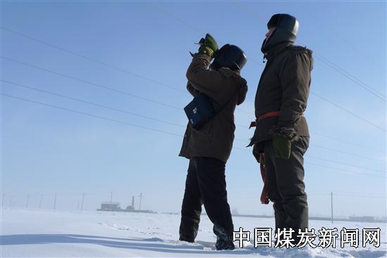 由于持续低温天气影响,供电线路松弛度缩小,易造成线路断裂,为保障矿区生产、生活用电,神华宝日希勒能源能源公司供电一线的巡线工人加强线路巡视,他们顶着寒风、踏着冰雪,走在荒郊野外,对矿区60公里供电线路进行巡视,确保供电线路安全运行。图为巡线工拿着望远镜,一基一基电杆的仔细查看。