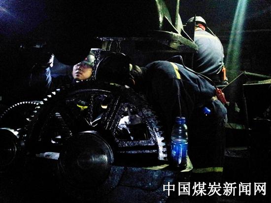 图为五矿青工朱光琚利用废旧塑料瓶喷出清洗剂擦拭齿轮、连接轴;青工赵玉红擦洗减速箱内壁。