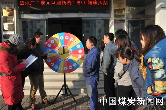 鹤煤热电厂工会、团委举行了“庆元旦、迎新春”趣味活动。图为安全知识问答“幸运大转盘”活动现场。(马凌雯)