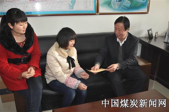 在慰问现场该矿党总支书记、工会主席王交奇为困难职工马艳朵送上了慰问金,鼓励她要积极面对困境,以良好的心态面对日后的工作与生活。