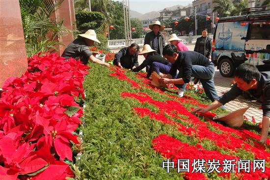 为确保节日花卉景观布置任务的完成,农林分公司全体人员分工合作,利用两天时间加班加点,从昆明采购鲜花,并利用电脑绘图、字体排版设计等一系列工 序顺利完成布绘。此次花卉摆放,用1000块花泥做花墙、800把石松打底、8000余株康乃馨绘字、800余盆一品红、一串红、万寿菊、鸭脚木勾边,拼摆出“团结奋进,平安和谐”八个大字。工匠们牺牲中午休息时间,头顶烈日,对一朵朵花儿进行精心剪枝、插放,翠绿的石松衬托着火红的康乃馨,显得格外鲜艳夺目,将办公大楼装扮一新,增添了祥和的节日气氛。