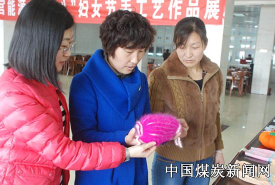 图为在该公司举办的女职工手工艺作品展上,创意新颖的参赛的作品吸引了观众的目光。