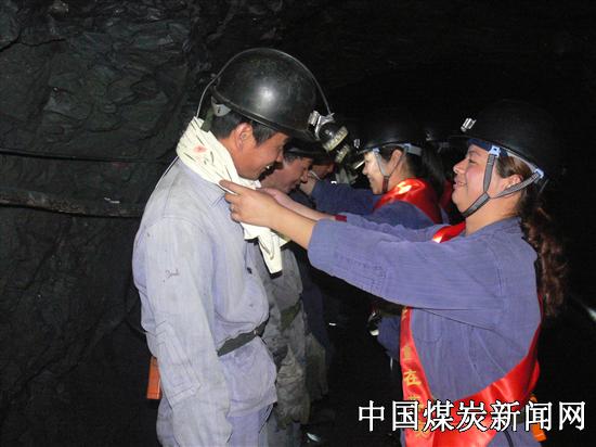 三八节前夕,福建永安煤业公司京东矿工会组织女工协管员深入到百米井下采掘工作面开展“节日送祝福,一线送温暖”活动。图为3月6日上午,该矿女工协管员在南区+580mE16#工作面,为一线职工送毛巾嘱安全时的情景。(凌德兴 郑春生)