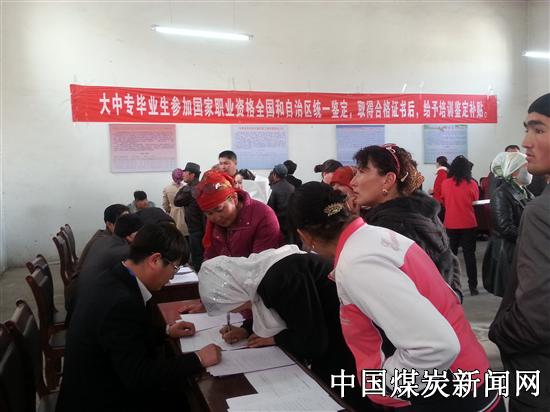 ![]() 图为乌恰县民族同胞在康苏煤矿招聘处填写登记表、浏览该矿简介