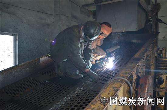 由于近期煤质灰分超标,煤炭发热量降低满足不了部分客户的需求,致使销售市场狭窄。为进一步提高煤质,该公司专门召开煤质研讨会,为解决主井振动筛进筛网太密、易造成网眼堵死的弊端,会上一致通过将振动筛圆形筛板直径由原来的Φ40更换成直径为Φ25方形筛板。而在随后的实施过程中,该公司机运队钳工组成员积极献计献策,不断尝试,大胆创新,最终将振动筛圆形筛板直径由原来的Φ40更换成直径Φ20的半圆形筛板,大大提高了煤炭夹矸筛分率,有效保证了煤质。 图为5月30日,该公司职工正在焊接振动筛板。
