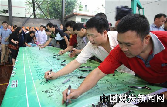 本网讯 “我坚决做到在今后的工作中,按章操作、决不违章。”6月9日上午8:30至8:50分,川煤集团广能公司绿水洞煤矿体育中心1500余名职工汇聚一堂,依次在题有“强化安全基础,推进安全发展”巨幅横标上郑重签名承诺,拉开了该矿举行的全国第十二个安全生产月咨询日活动序幕。
