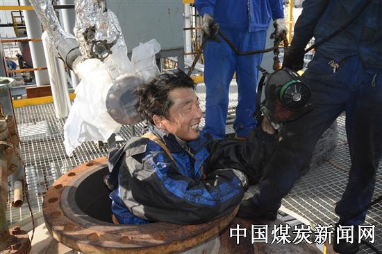 这是在神木富油能源科技有限公司六月份检修中,一名检修工人在完成检修工作后,从塔内爬出时捕捉的画面。满头的大汗、满身的油污无法影响到检修工作完成的喜悦。