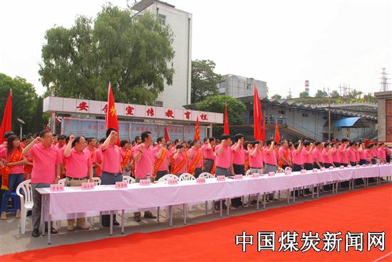 这是6月10日,在阳煤五矿福利楼前的安全生产高潮日活动中,矿长王冬平带领矿上领导和员工进行的安全宣誓。