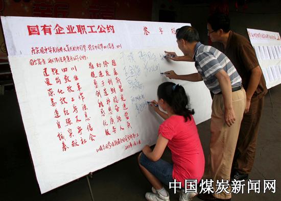 6月27日,川煤集团攀煤精煤分公司举行了国有企业公约签字仪式,以使广大干部职工进一步达成共识,增强其凝聚力和责任感、使命感,为实现个人梦、企业梦、中国梦立足岗位努力工作。该公来60余名干部职工进行了首批签字。图为干部职工正在签字。