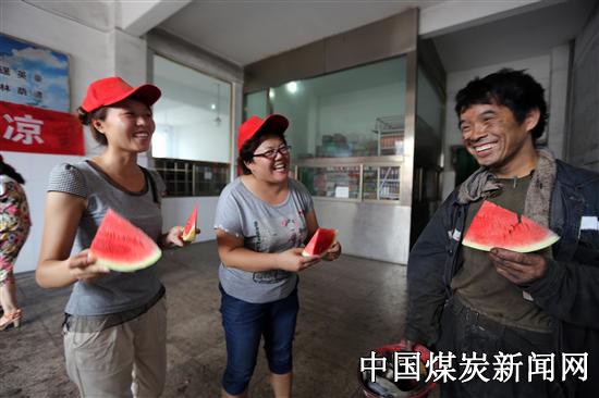 在井口,“小红帽”志愿者把西瓜、绿豆汤送到上下井的矿工手中,不时叮嘱大家在作业时要注意安全,克服麻痹思想,严格按照规章制度进行规范作业,把好安全这一关,并鼓舞大家战高温、斗酷暑、促生产、保安全。