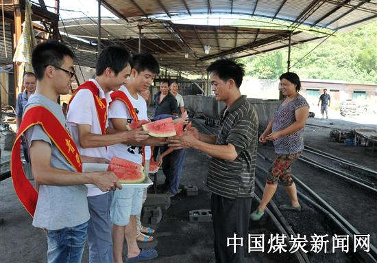 青年志愿者们顶着烈日,冒着酷暑,深入到提升运输、绞车房、洗煤车间、检修车间等重点场所,把一块块香甜可口的西瓜送到一线职工手中,并叮嘱大家要按章作业,注意安全。