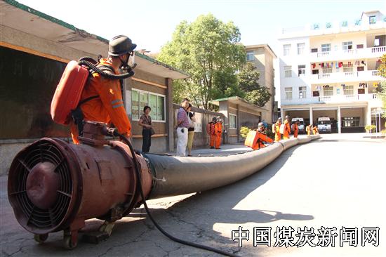上 图为:8月7日,考试中新队员佩戴呼吸器按照质量标准化要求正在连接通风机电源开关,接受考官评分。 图为:8月7日,在考试中新学员佩戴呼吸器连接电源和风筒后,立即通电、试机、正常送风等。接受考官评分。