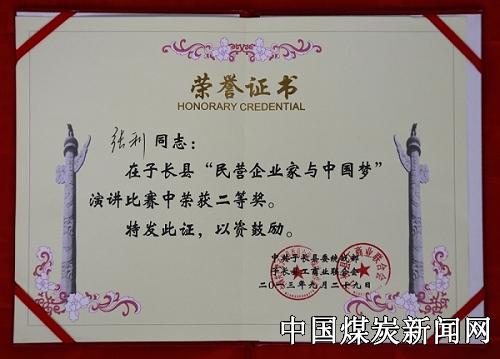 9月29日,陕西延安子长县委统战部与子长县工商业联合会组织举办了“民营企业家与中国梦”演讲比赛。临矿集团永明煤矿职工张利演讲《中国矿工梦》荣获二等奖。图为获奖证书。