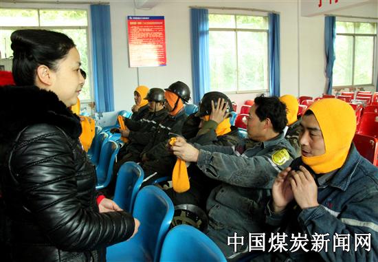 新年一开始,四川煤炭产业集团达竹公司斌郎煤矿工会女工委从关爱职工身体健康出发,积极为职工办实事、办好事,在冰雪霜冻的寒冷时节,组织家属安全协管员一针一针赶织头巾、耳罩、围脖于一体的保暖防风头套55个,作为新年礼物送给井下机车司机和矸石山露天作业的翻矸工,为他们送去了家属协管员的关爱和新年的祝福。图为工会女工委为职工送防风头套时的情景(潘广平 摄影报道)