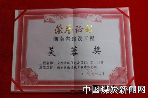| 湘煤集团楚湘建工承建的岳阳金税荣城住宅小区项目获首个“芙蓉奖” | |||