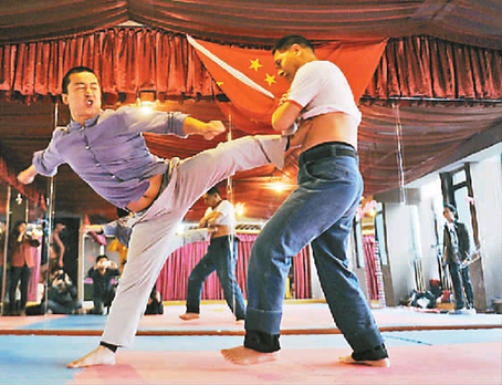 在高速拍摄下谢水平手中筷子快速被弯曲折断 ●“如果有人真的需要发泄,我有时会故意退一步,让他发泄出来,心情就好了” ●为别人退一步,也许你也能做到 “职场压力大想发泄?遇到不顺心的事想打人?别着急,请找谢水平。”这是一名“挨打专业户”的自我介绍。昨日,有人拨通重庆晚报24小时新闻热线966988称:他职业挨打14年,近日来到重庆,想拜托重庆晚报帮忙找一些高手切磋一下。 为什么有人以挨打谋生?他真的如自己所说那么厉害?昨日,重庆晚报记者找到了49岁的湖北孝感人谢水平,据他自己大致统计,14年职业挨打生涯里,在全国各地表演上千场,出场费从最初的50元,到现在的2万元,月收入七八万元左右。 现场 武馆老板飞踹他只单脚后退 “你们只管找人,体育老师、跆拳道高手,甚至拳击手都没有问题。”在重庆北站附近的一家宾馆,谢水平拍着胸口豪言。他穿的白T恤上印着“挨打专业户谢水平”字样,个头挺高,并没有健美的肌肉,甚至还有点小肚子———两个字,普通。 “真的不怕打?”重庆晚报记者问。谢水平笑了笑,解释挨打的规则:不能用武器,只能打腹部,他单脚退一步算平,双脚都退算输,在收费挨打时,平局免费,算输他倒贴钱。 昨日下午,记者联系到一家武馆的老板周小龙,他自称曾在少林寺学过功夫,从事武术教练10年,表示可以跟谢水平过过招。来到武馆,谢水平没有热身,他称只需要两秒,就能将身体调整到最佳状态。 两人赤脚站在塑胶垫板上,周小龙站低桩,使用钻拳。他解释,低桩可以最大程度发力,而钻拳是他最擅长的。谢水平双腿微微弯曲,将T恤上裹露出腹部,双手抱怀说:“来吧,用全力。” 周小龙活动了下胳膊,对准谢水平腹部。“嘿”一声低喊,一拳击出,肌肉的碰击发出脆响,谢水平双脚只轻微晃了晃,说:“力气不够,再来。” 周小龙对着谢水平腹部虚送了几下拳头,凝神再次击出一拳,响声更大了,但谢水平仍只是晃了晃。记者观察,谢水平的腹部有明显的前挺动作,接触到周小龙拳头那一刹,似乎又往后收了收。 第三拳,周小龙将重心降得更低,当拳头击中谢水平腹部时,却往旁边一偏,谢水平左脚往后小退了一步,双方算打平。“不错,不错。”谢水平说,他见过不少高手,周小龙的拳力算中等偏上了。 周小龙告诉记者,第一拳他试探性地用了五成力,后面两拳都用了全力,谢水平确有真功夫。 为了让记者有直观的感受,谢水平让周小龙往后退几步,用脚飞踹。几次踹下来,谢水平仍然只是单脚退后,另一只脚虽然抬起,但没有后退。 普通人打谢水平是什么感受?男性、身高1.73米、体重70公斤的记者做了尝试。 “你可以往后退几步,冲过来打我。”面对谢水平的“挑衅”,记者退了三四米,全力冲过去一拳,谢水平纹丝不动,脸上还带着笑意,记者打完第一感受是:拳头疼。第二拳打出,整个手臂都疼,谢水平挨打时甚至与旁人聊了起来。第三拳,谢水平用金鸡独立姿势,记者仍没能让他哪怕后退半步。