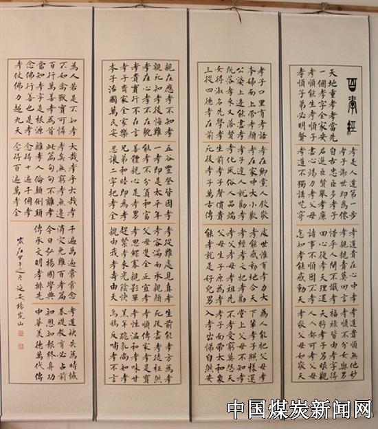 ![]() 作为一名普通的煤矿工人,杨岚山年轻时就酷爱书法,上世纪七十年代始临池,先入唐楷,后学魏晋,直追秦汉,能写诸体。07年退休后,为了使自己的书法造诣更上一层楼,他报名参加了延安老年大学的书法班,系统的学习了甲骨文、经文、小篆、行书、草书、楷书等书写方法,对颜真卿、柳公权、褚遂良、虞世南、王羲之等书法大家的书法作品进行了临帖,仅三年时间,练习的草稿都能装满一辆小型货车。长期的坚持不懈与苦心研究也使其书法作品气韵独到,自成一体。不少书法大家对他的作品都具有极高的评价,认为杨岚山的书法作品:“轻瘦精道,书味深浓,师古创新,风格独特”。