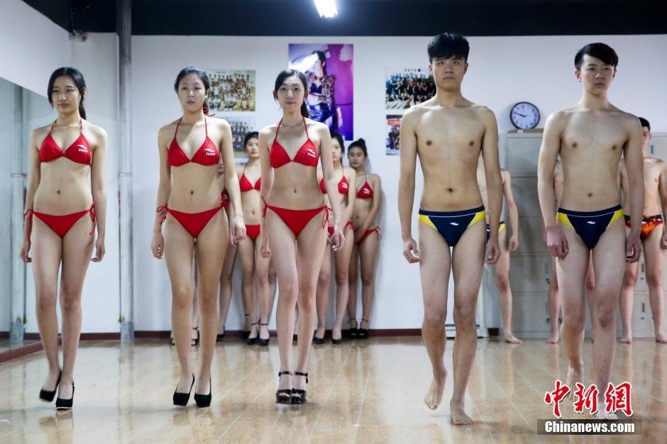 2014年12月8日,山东省青岛市,报考模特专业的艺考生备战2015年艺考上演比基尼秀,帅哥靓女美丽“冻”人。