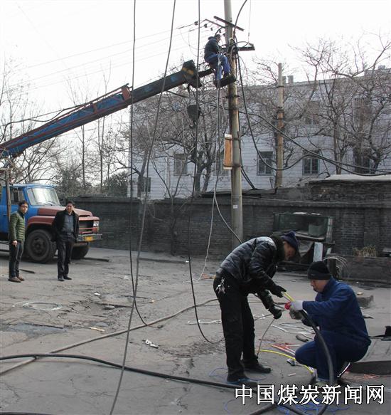 该部按照冬季“三防” 工作要求,对矿区5个物业小区供电线路展开查隐患保安全供用电大检查,针对医院住宅小区4栋住楼主供电线负荷大、容易发生用电事故的安全问题,对原运行的86米裸体架空线路改为电缆悬挂线路供电。经过7个多小时工作,更换后的电缆供电线路截面积增大,既满足冬季小区用电需求,又杜绝了用电不安全隐患,提供了安全可靠的供用电环境和条件。图为机电人员更换线路场景