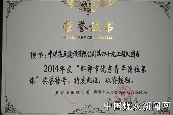 | 中煤五建第四十九工程处团委荣获2014年度“邯郸市优秀青年岗位集体”的称号 | |||