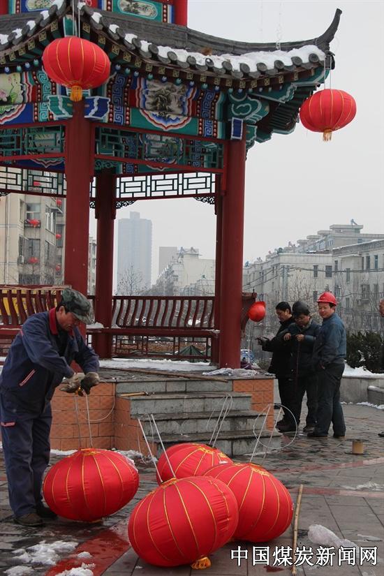 到了!这是2月8日中午山西阳煤集团二矿的工人师傅们冒着寒风,在二矿工业广场悬挂大红灯笼。