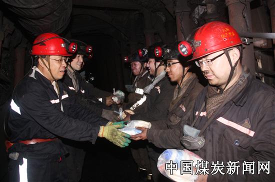 本网讯  “大家辛苦了,这是公司给大伙的‘慰问品’,祝你们在工作的时侯做好安全。”3月11日上午,神宁集团金能煤业分公司工会深入井下开展送温暖、送安全慰问活动,他们将一份份饱含安全祝福的“慰问品”送到一线员工手中。(图为该分公司工会人员深入井下Ⅲ010301综放工作面,为工作在一线的员工送上牛奶、鸡蛋等慰问品,并叮嘱他们要按章操作、保证安全。)