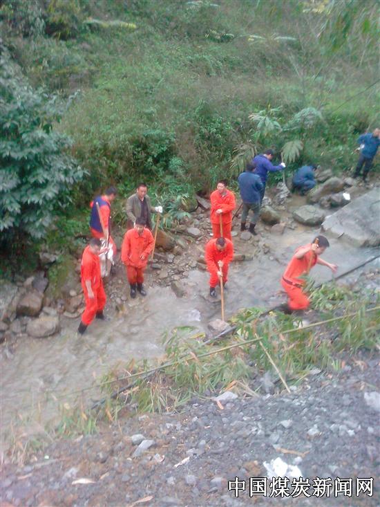 患。 宜宾天池集团金堂煤矿西回风井位于宜宾珙县底硐镇明建村,沿村落的一条溪流,干沟河,春暖花开之际,与山谷其它山涧流水混合为一股,在距离西回风斜井1.5公里处,呈漩涡状渗入地下暗河,由于喀斯特地貌,大量裂隙纵横和其它地质原因,加上地下暗河与金堂煤矿西回风斜井井巷距离垂直高度100米左右,使这股地下暗河的强大水流涌入西回风斜井。 3月21日下午,西回风斜井治水小组研究井巷顶板涌水源头时发现这一情况,川南建工金堂项目部和业主方的管理人员50余人,带着尖、方掏扒和方铲、彩条布、水泥等工具和材料,赶到干沟河漩涡状渗入地下暗河的结合处,分为两组,一组用尖方掏扒、方铲清除漩涡处淤积,工具够不到的地方用手搬石头、抠淤泥,二组用水泥将裂隙封住,彩条布遮盖,沙包紧压,用“疏、堵、截、排”相结合的方式,堵住这股水渗入地下暗河,减小金堂煤矿西回风斜井井巷顶板的涌水量,为尽快治理好水患创造条件。