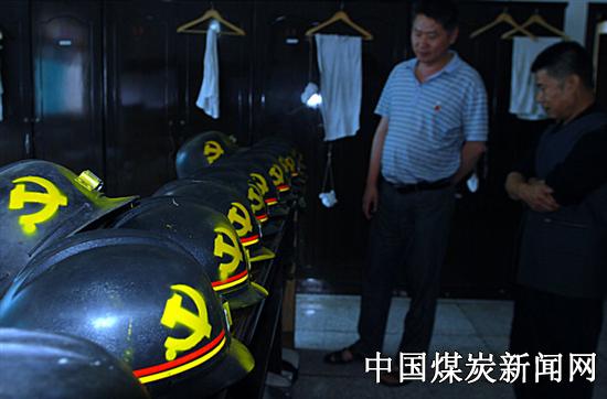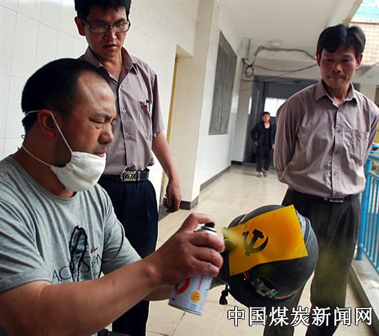 活动要求“党员上岗佩党徽,井下安全帽上要体现党徽,让党员亮明身份。每一位党员在岗期间,必须佩戴由公司党委统一发放的共产党员标识,即在地面的佩戴党徽;在井下的安全帽上喷上党徽图样。以此达到:共产党员更加自我约束,让群众时刻监督党员的言行。该公司的活动还创建了党员先锋岗、党员示范岗、党员责任区等,充分发挥党员的先锋模范带头作用,树立党员良好形象。还结合实际,深入开展“一对一”、“一对多”结对帮扶活动。使党员的形象在党徽中得到体现,党徽的光泽在安全帽上迸发出光芒。图为该公司组织部门负责人,从节约出发,自行在矿帽上喷制的党徽图样。