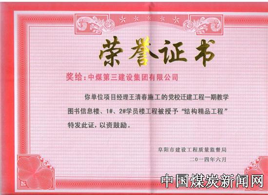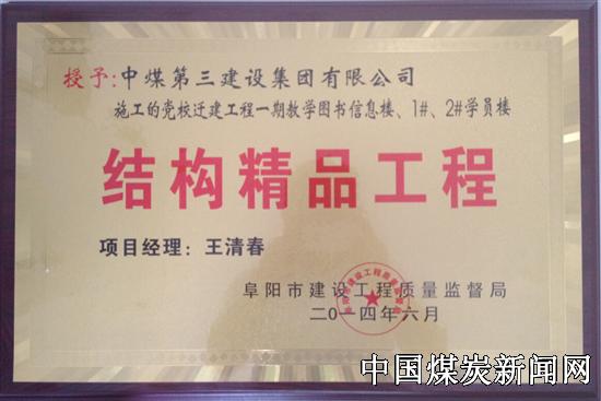【本网讯】近日,从阜阳市建设工程质量监督局获悉,由中煤第三建设集团建安公司承建的阜阳党校迁建工程一期教学图书信息楼、1#、2#学员楼工程,获评阜阳市“建筑结构精品工程”称号。