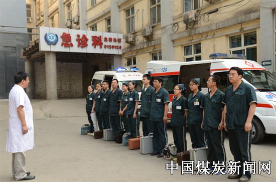 ![]() 演习场景一:峰峰集团总医院值班人员在打电话上报....., 依据总院重大工伤抢救预案,总院值班人员在接到接到峰峰集团指挥中心的救援命令后,立即通知医务部、主管院长,并召集应急小分队既刻启动应急预案。 ![]() 演习场景二:峰峰集团总医院主管副院长田小运迅速组织人员,三辆救护车紧急调派到位,应急小分队携带急救药品和器械,跑步集合到位,整装待发。峰峰集团公司总医院医疗救护队长:“报告院长,医疗救护队员已全部到齐,救护药械准备完毕,请求出发!” 总指挥田小运一声令下“立即出发!”急救小分队跑步奔向救护车。