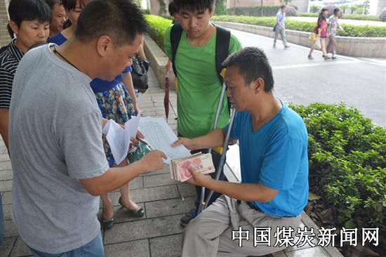 ![]() 图为同学、亲朋把募集到的捐款交到文伦福(右)手中