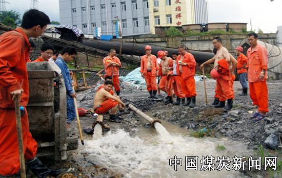 为了防止淹井事故的发生,全体人员接到通知后奔赴到管子井,展开了抢险工作,领导们根据现场实际情况,制定方案,采取措施,一方面在地面挖防洪排水沟,在井口用沙袋筑防洪墙;另一方面在井下新增一趟100D水泵,安装Φ108排水管,将碛头的水引出地面。 清晨,由工程部牵头,各部门配合,对三条斜井(主斜井、副斜井、管子井)周围的防洪水沟进行彻底清理,为保障短时间内将碛头的水抽干,24日上午,井下再次增加了一趟Φ219排水管。由于23日深夜降雨量大,三条斜井多处地方垮塌严重,防洪沟里的水溢满地面,三条斜井周围成了一片沼泽,他们用铁楸挖、铲子铲,堵塞严重的地方弓着身子用手去刨,有的跳进泥沼里搬石块,有的趟在水沟里清淤泥,水和泥浆灌满了筒靴,他们全然不顾,衣服裤子被水打湿,他们脱掉衣服赤身苦干。累了,坐在旁边的石块上休息一会,饿了,喝口矿泉水,长达9个小时的连夜工作,他们的声音嘶哑了,眼睛布满了血丝,没有人叫苦,也没有人叫累,全身心投入到抢险工作中,中午13:00左右,地面抢险工作已经全面完成,调度室接到电话,管子井碛头水位基本稳定。