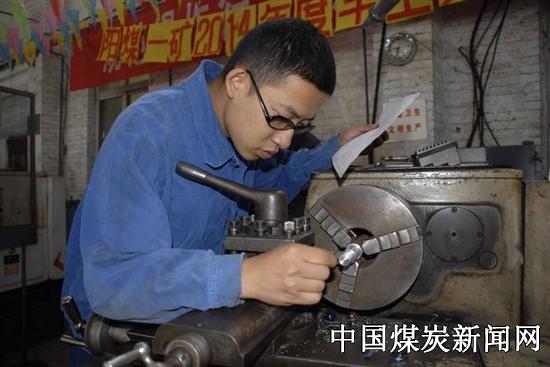 【本网讯】7月25日,山西阳煤一矿2014年车工技术比武现场,选手正在进行偏心螺丝的制作。