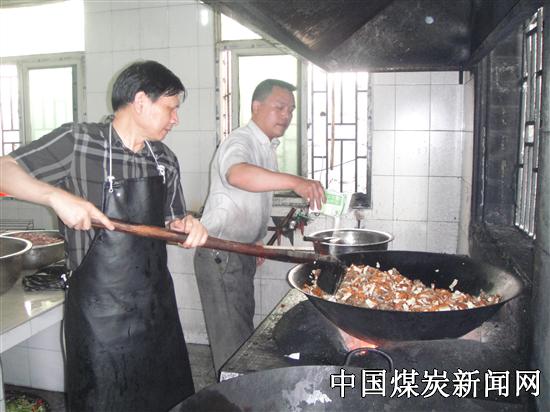 本网讯 7月8日上午9时,湖南省煤业集团街洞矿业有限公司党委书记许永德,来到茶山岭煤矿班中餐食堂,检查班中餐质量问题。见师傅们正准备中班的班中餐,于是许书记兴致勃勃地系好围裙,手拿锅铲,动作纯熟地当起了班中餐的大厨。煎油,香干子炒瘦肉几乎是一气呵成。 许书记边炒菜边问中班班中餐的数量及班中餐的标准,在旁的邓师傅说:中班有280多盒,标准是每盒三两肉、四两米。