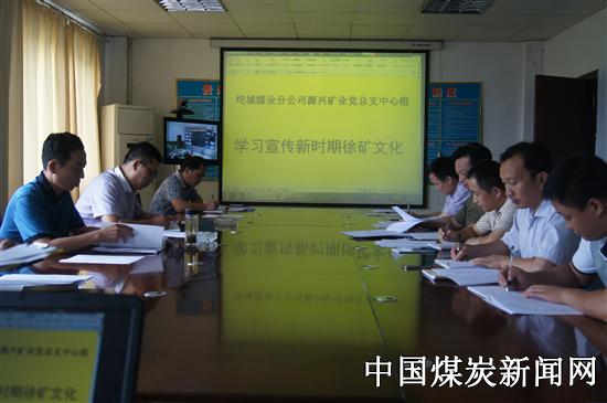 【本网讯】 连日来,江苏徐矿集团垞城煤业分公司源兴矿充分利用党总支中心组学习、干部理论学习、职工活动日等形式,组织干部职工分章节、系统学习新时期徐矿文化,掌握内容,熟记理念,努力使新时期徐矿文化广为传播、家喻户晓、入脑入心。同时,结合企业实际,认真制定宣传计划,在工业广场、办公楼、井口及主要干道等场所,利用橱窗、宣传条幅、板报等形式广泛宣传徐矿文化,迅速形成强大的舆论氛围,提高徐矿文化的普及率、知晓率。图为:8月13日,该矿利用党总支中心组学习时间系统学习新时期徐矿文化。