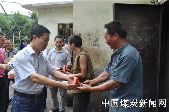 持续的高温,强烈的阳光,灼热的热浪影响着矿区的生产、生活。为提高员工工作热情和积极性,广旺公司纪委书记、工会主席陈劲松,副总经理王灵率总部第三党支部来到唐家河矿,为生产一线员工开展送清凉活动,把西瓜、苹果、牛奶、面包等慰问品送到每位上下班员工手中。