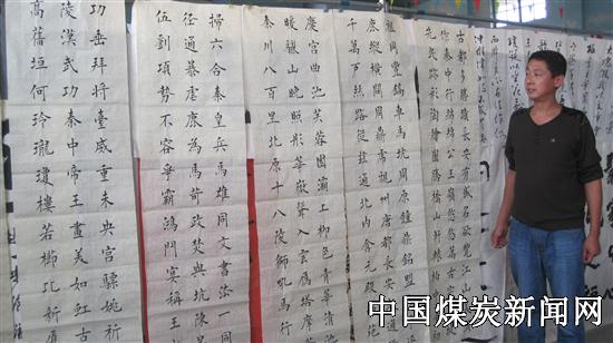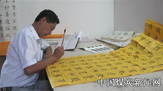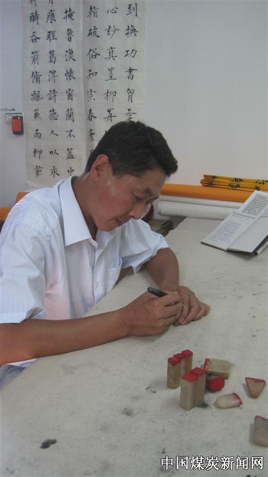 ![]() 安聚海是蒲白实业白水矿社区一名小车司机,他可以说是在陕煤化集团公司小有名气。他不仅书法写得好,而且篆刻章子也是个行家,还自编自演小品。不但白水矿社区到处有他的书法,兄弟单位及个人也慕名而来求他的书法。他自编自演的小品惟妙惟肖,有老太婆、少妇、美女等,曾经在一部小品中客串5个角色。为了演好每一个角色,他一遍又一遍的练习、模仿,有时进入角色连吃饭都忘了。媳妇气的开玩笑说:“你真是个疯子。”现年 41岁的安聚海是陕西省书法家协会会员,作品多次在各类书画展上获奖。社区人人对他竖起了大拇指,夸他是个多才多艺的大能人。 ![]() 安聚海自幼就酷爱书法及篆刻章子,主要习练楷书和行书。他书写的楷书端庄雄伟,行书古色古香。既有厚重、质朴等鲜明特点,又有刻帖、遗墨清丽、婉约、绵长的韵味。无论是巨制佳构还是尺牍数纸,字里行间处处充溢着直率、朴厚、开张,且具有相当纯熟的形象感受能力、想象和艺术表现力。看到他手上的伤疤时,他说:“这些伤疤都是我一次次练习刻章子时不小心刻到手上的,但因为爱好我从没有想过放弃。练习书法也是一样,当我俯首案头,一拿起笔,便会忘记时间,放下笔时常已是半夜时分。”1990年入伍的安聚海成了一名军人,得到中国书协理事熊少军老师的授教后,潜心修炼,长期临池不断,功夫不负有心人,1993年在部队曾获国防大学书法比赛一等奖。参加工作后,哪怕再忙再累他也不曾懈怠。他认为,搞书法就要埋头苦干,不要张扬,潜心吸收传统文化才能写出好作品,才能进入一种自由自在的境界。在艺术追求的人生中,就如日夜不停地在地壳深处采掘劳作,永无止息。看到他对书法的酷爱,白水矿社区领导还专门为他腾出了一间房作为他的书法习练室,这对他无疑又是一个鞭策。如今,小有成就的安聚海延续着单位的老传统,从事着“传帮带”的工作。经常与职工开展书法及篆刻交流活动,带动和影响了不少年轻人对书法和篆刻的爱好。近期他又在忙碌的准备作品,将参加省级和国家级书法大赛。