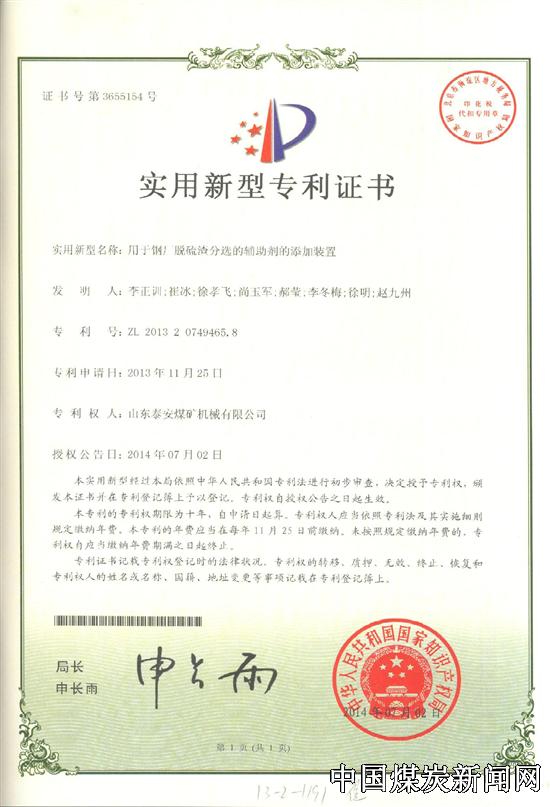 【本网讯】近日,笔者获悉山东煤机集团两项实用新型专利:用于钢厂脱硫渣分选的辅助剂添加装置(专利号ZL201320749465.8)和用于钢厂脱硫渣分选的固液分离装置(专利号ZL201320749518.6)均获得了国家知识产权局正式授权。
