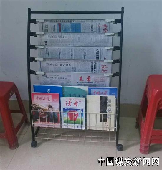 新维煤业公司综合队在学习室里建立了临时书架,书架上摆放着各种新闻报刊杂志,工友们闲时阅读查看,了解新闻信息。为扩大信息范围,工友们也拿出了自己的书籍杂志摆放在书架上。